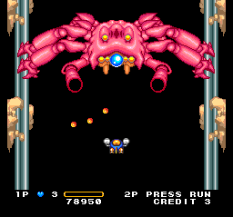 TB's "pelt-a-bell" power-up system (blast an uncovered instrument to effect a change in the weaponry that can be acquired from it) is inconvenient and yields weapons that are nothing special. Its music is completely inoffensive but forgettable and is often drowned out by the sound effects, which are decent but not noteworthy aside from the impressive ones used for explosions. Personality is essential for a cute 'em up, and this game has it, but not nearly as much of it as true stalwarts of the subgenre like Parodius have. It's short and quite easy. And while its bosses are cool enough in appearance, you shouldn't anticipate any thrilling confrontations.