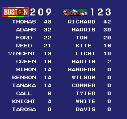 Then I got annoyed with it. The games run way too long, with no apparent means of shortening them available. The screeching music drives me crazy, even after I set the volume incredibly low. And the worst part of all is the "difficulty curve." Exhibition and early Tournament matches present practically no challenge: you'll be ahead by an insurmountable margin at the end of the first quarter and have to endure three more long periods before finishing up or advancing. But later in the tourney you'll encounter steal-happy opponents who need do little more than graze your players in order to capture the ball. Of course, despite their defensive "skills," the computer-controlled ball handlers still perform foolishly, making it easy to regain possession and transforming the game into a turnover fest. And when your dopey foes finally start to wear down, you'll have no trouble nailing boatloads of successive baskets and taking control of the contest completely. I certainly don't expect realism from the Takin' experience, but these sorts of matches are just plain stupid.