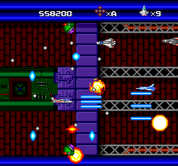 Be warned that your weaponry may seem fairly meek at first. If you're to succeed (and have fun with the game), you'll have to find armaments you're comfortable with and strengthen them while making good strategic use of your auxiliary equipment (especially the somewhat-rare shields, which not only protect you but also allow you to plop your craft atop enemies [even bosses] and quickly demolish them). Once my laser reaches maximum strength and I grab some homing missiles along with an option or two, I'm pretty much unstoppable--and I'm also having a lot of fun. The only grievance I have at that point is that the stages are a bit too long.
