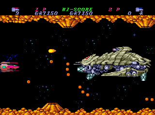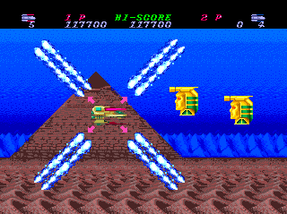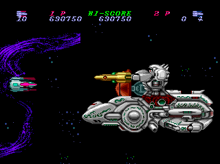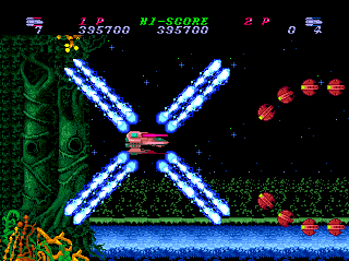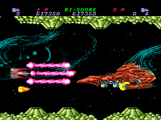 I'm not a huge fan of the "choose a direction" cannon system (you use only one weapon throughout but decide on the fly whether it fires horizontally, vertically, or diagonally), and I don't lament the fact that it wasn't taken on by any other PCE shooters, but Toaplan implemented it well enough that it's effective as a one-game gimmick.