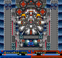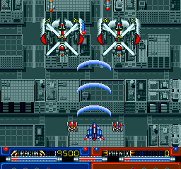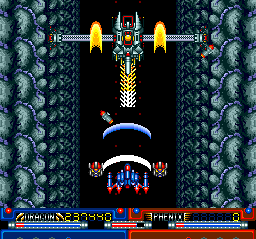 To combat those behemoths, you can make use of special dual-ship attacks that you acquire energy for by collecting capsules that appear throughout the levels. Wreck your opponents with a mega beam a la Soldier Blade, or sear them with phoenix fire a la Terra Cresta II.