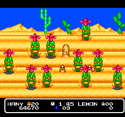 Simpleton bosses are not the only problem here. Hany is a speedy, slip-sliding sort who's sure to crash into enemies or stumble off platforms despite your best efforts to avoid collisions and remain on solid ground, and his backflip technique has very limited range. Some of the stage designs seem, at least initially, to demand tighter, Super Mario-style controls and a more reliable primary attack. Practice and memorization will help decent, dedicated players overcome most of the gameplay issues. A tough desert stretch with quick-tugging quicksand and lots of dangerous cacti seemed rather irritating to me until I developed a feel for the board--and it ultimately became my favorite level in the game.