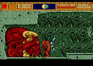 You'll now begin a long, difficult climb towards the top of the room. Keep in mind the gaping hole at the bottom while you're jumping from one platform to the next. You should constantly flail away when you're standing still or riding on a moving platform (you need only hold down the attack button to make the troll throw punches repeatedly). This will give you some protection from the boulders that are falling towards you.