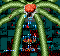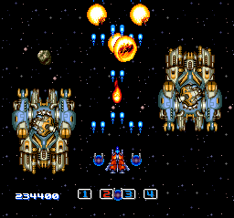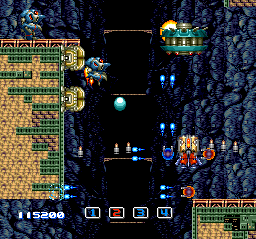 The first Image Fight is no pushover, but I don't think it's nearly as demanding and punishing as many tout it to be. Its sequel, on the other hand, is nightmarishly hard and really seems to revel in the dismembering of players. If you're okay with risking dismemberment, go ahead and take up its challenge--and prepare yourself for a ten-level-long journey that'll demand constant attentiveness and be nothing if not hellish for long stretches at a time. You'll frequently find yourself navigating uncomfortably tight spaces as powerful enemies soar onto the field from the front, side, and rear (and even emerge from the backdrop at particular points). These steel-ship berserkers typically dart about erratically and launch hard-to-evade projectile attacks.
