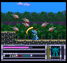 No one should have much trouble reaching the text-screens of triumph, despite the meekness of the Alzadick craft's guns. Four different primary weapons can be acquired and utilized, but they differ merely in the directions their stick-shots spread out in. Also on offer are four super-powerful one-off auxiliary weapons.