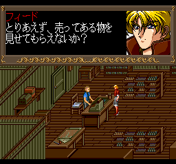 Like Exile's, Blood Gear's town sequences represent a departure from its action scenes in that they're viewed from an overhead perspective. While they do ask that you partake in the usual RPG acts of commerce and clue garnering, they often also have you perform amusing little tasks, like breaking out of a prison and subsequently stealing an enemy soldier's uniform to engage in a bit of espionage.