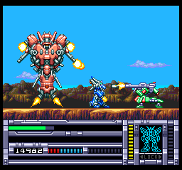 Like The Adventure of Link, Blood Gear places heavy emphasis on sidescrolling action scenes. But rather than having you assume the role of a scrawny elven lad brandishing a tiny blade, BG provides you with giant mecha capable of wielding lightsabers, mega-bazookas, shotguns, and a wide variety of other devastating arms. And instead of poking around mere woods and palaces, you get to explore factories, tundras, storm-lands, underwater bases, mechanized caverns, and the depths of outer space.