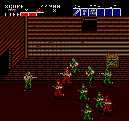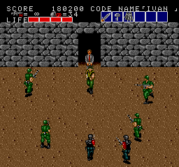 Well, if you’re going to get any enjoyment out of this adventure, you’d best be of the ilk that finds amusement in such classics, as Bloody Wolf struggles a bit with its fundamentals. Gameplay-wise, it doesn't fare well in comparison with the similar (and much deeper) Last Alert. It lacks LA's varied mission objectives; instead, it delivers fairly straightforward run-and-kill stuff along with occasional hostage-rescue missions. Its control scheme is rather cumbersome (you can make use of two different weapons at once, but the second is triggered via the Run button) and doesn't feel as refined as LA's (forget about strafing). And your knight errant's adventure comes to an end much more quickly than Guy Kazama's does.