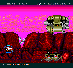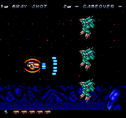 Many people complain about its high level of difficulty, but it can't be all that hard if a Turbob Grafx rookie like me was able to complete it in a day. I acknowledge that its opening moments can be a bit discouraging, as you're at once forced to deal with relentless enemies who fire extremely fast bullets. But if you can survive the rough early going and power up a bit, you might just find that the game is beatable and enjoyable after all. Grabbing and strengthening the multi-way blaster and learning the layouts of the first two stages (and how to defeat their respective bosses) will lead to success in the long run. With a little bit of practice, you can reach the third stage with a full stock of lives and a high-powered gun that covers an enormous amount of space with its shots. Your craft won't seem helpless anymore, and you'll start obtaining shields to boot. Suddenly, the enemy armada won't seem so tough.