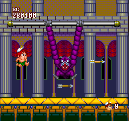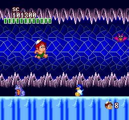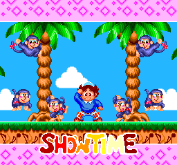 Sadly, I can't say I'm quite as fond of the silly post-stage sketches (during which our chubby hero prances and dances about with gaggles of goofy animals). Even less appealing is the game's repetitive, obnoxious music; and while there are some impressive multilayer scenes to behold, the visuals seldom deviate from typical old-school-platformer fare. Don't count on a high level of challenge offsetting the aesthetic disappointments, as almost the entire adventure is cake, with no truly tricky spots until Stage 6 (of 7), and every boss (including the last one) is easy to defeat.