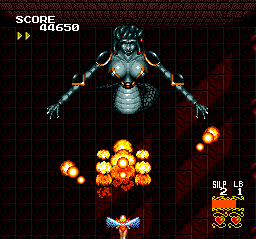 The weapons are Compile style all the way, but the game doesn't feel like other 16-bit Compile verts (such as Blazing Lazers and Spriggan). This isn't an unwelcome difference, as there are plenty enough of those 16-bit "Aleste-style" shooters. There's still lots of action here; the highest difficulty mode in particular feels hectic in the manner that a good, solid shoot-'em-up challenge should (in other words, it isn't a mere mess of projectiles). And the bosses and midbosses are enormous mythological monstrosities.