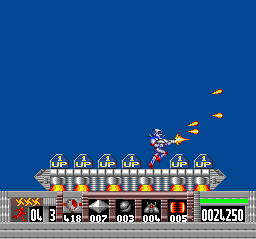 Turrican seems so promising on paper. Its levels are huge, allowing for Metroid-fashion exploration; it features Contra-esque run-and-gun action; and it provides you with a decent assortment of weapons and attack-types, including a spread gun, a laser whip, and an alternative spinning-razor form. Unfortunately, the gameplay bypasses "challenging" and heads straight for "cheap," mucking up the chip's potential for greatness (and even goodness).