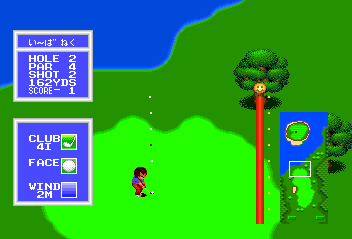 I know you're thinking to yourself that I'm getting all pumped up over something really stupid, but you need to understand where I'm coming from. You'd be surprised by the number of PCE golf games I've seen mishandle this simple play element. Power Golf 2's shots sputter their way towards the hole, while Ganbare's barely seem to get off the ground. Even the masterful Fine Shot Golf kinda misstepped by having its ball simply launch itself into the sky rather than showing a dude actually hitting the damn thing. But here we've got a game that executes first shots in a cool way.