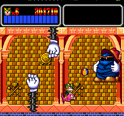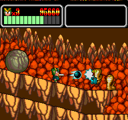 Monster Lair isn't an easy game to get through. Its challenge is derived more from its length than from its combat or run-and-jump action. Taken on their own, the two-part stages (each of which contains a "hack-and-blast" section as well as a straightforward shoot-'em-up segment) aren't very difficult to get through. But with fourteen of them to conquer, players must put in practice and engage in repetition to be able to anticipate all the tricky spots.