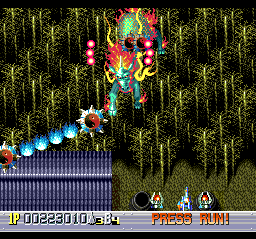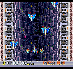 Contrary to what you might expect from an Irem shooter, you can wing your way through almost every part of the game without bothering to memorize anything, as most of the enemies offer very little in the ways of pursuit and resistance. In most places, it's easy enough to flee from your foes if you're low on power and not a problem to bust them up if you're high. (It's worth keeping in mind that you're occasionally rewarded for facing and defeating tougher enemies rather than flying away.) While you're cruising along, you'll just need to keep in mind that there are a couple of spots where you can get killed in the blink of an eye if you're not being careful.