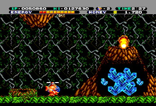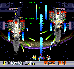 The slowdown in spots is atrocious: calling to mind Rayxanber II, there was a time when I was in the fifth level with full fire and a lot of enemies about, and the slowdown became so bad that my gun stopped firing. (Thankfully, the ol' Ray II trick of placing the turbo switch in the middle position works here as well.)